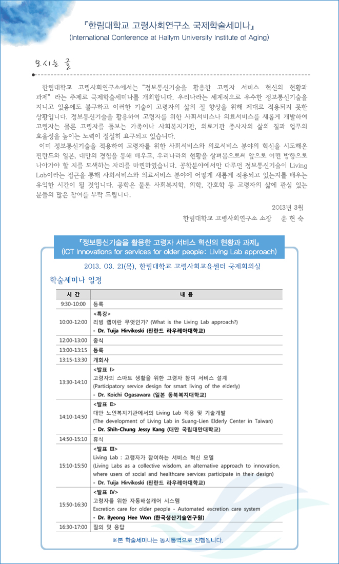 장소: 한림대학교 고령사회교육센터 국제회의실