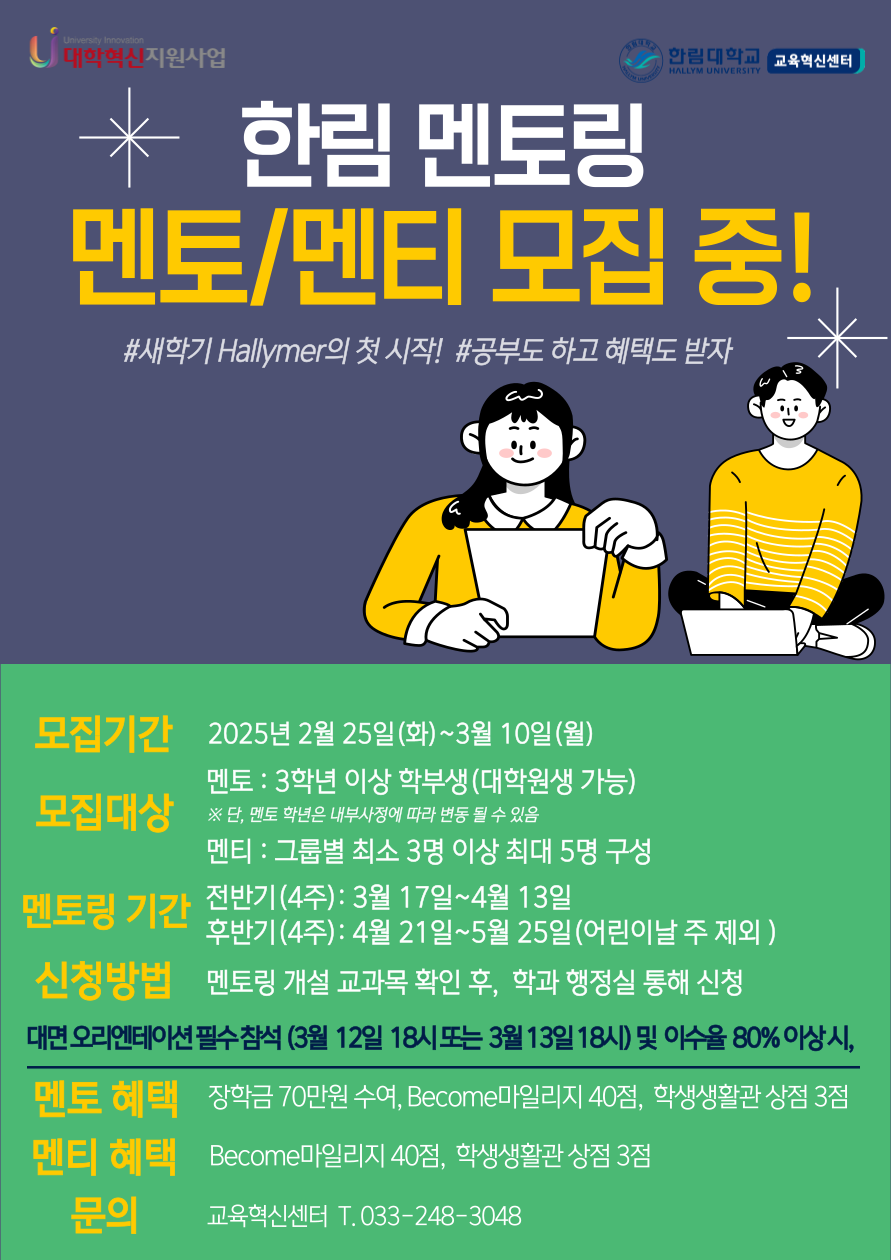 교육혁신센터에서는 <2025학년도 1학기 한림멘토링>에 참여할 멘토와 멘티를 모집하고 있습니다.