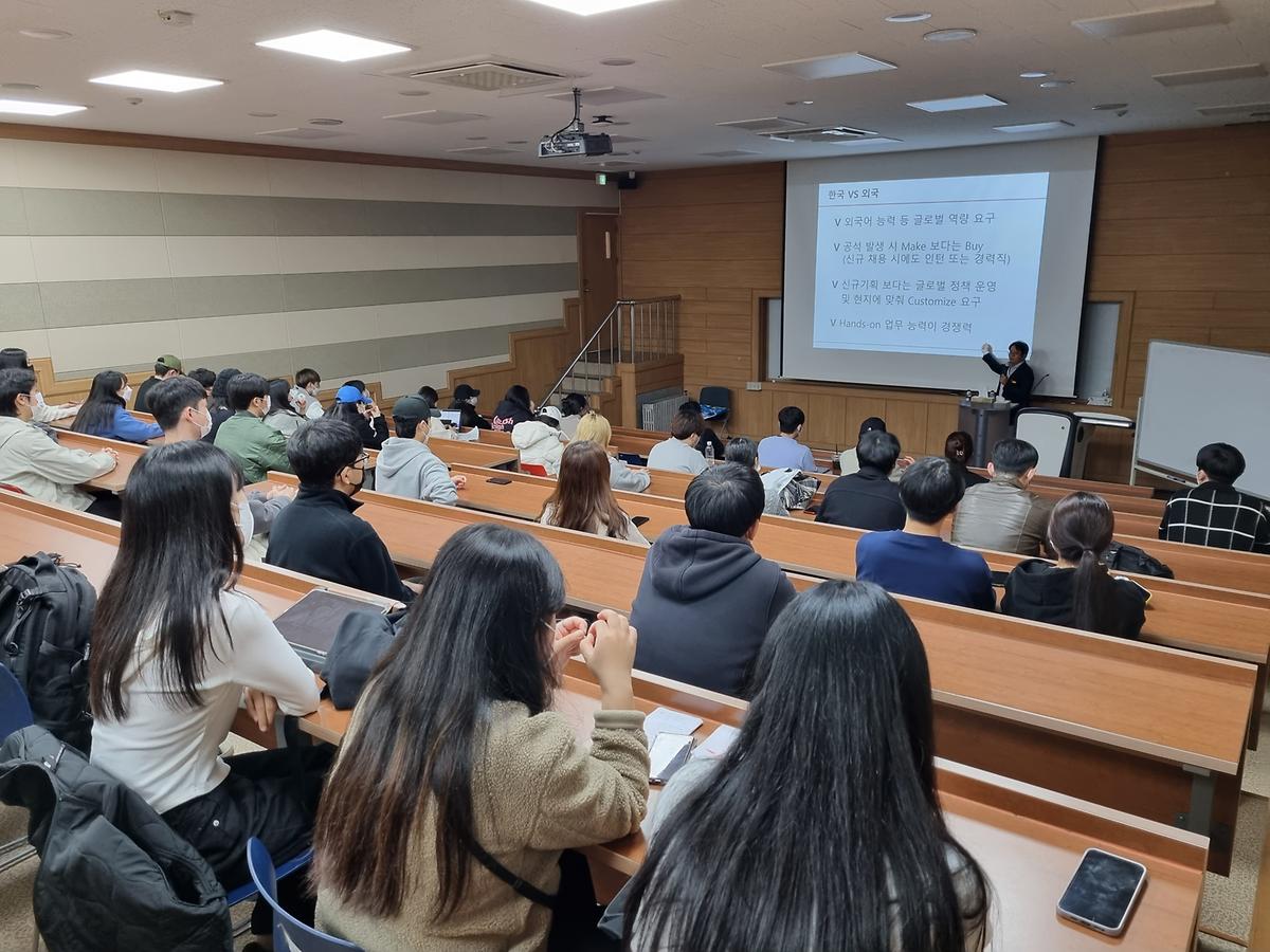 이번 특강에서는 한국기업과 외국기업의 차이에 대해 설명하였습니다. 조직계의 차이와 기업에서 요구하는 신입직원 능력 혹은 기업문화 차이 등을 자세하게 배워, 외국계 기업 취업을 희망하는 학생들에게 정보를 제공하였습니다. 또한 코로나19 유행 이후의 언택트 시대와 포스트 코로나, 위드 코로나 시대의 기업 채용 현황에 대하여 학생들이 취업을 준비할 때 필요한 내용을 중점적으로 특강을 진행하였습니다.