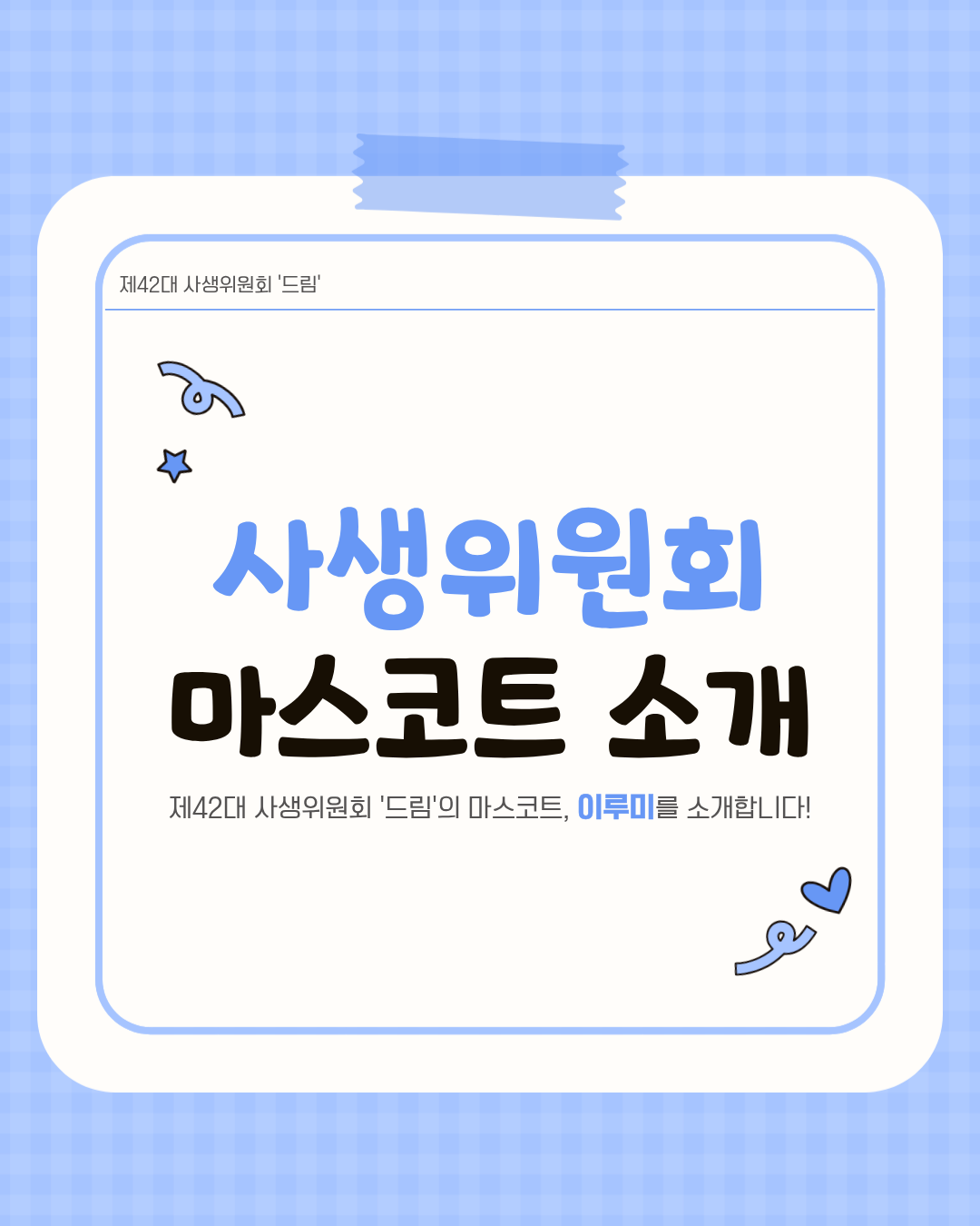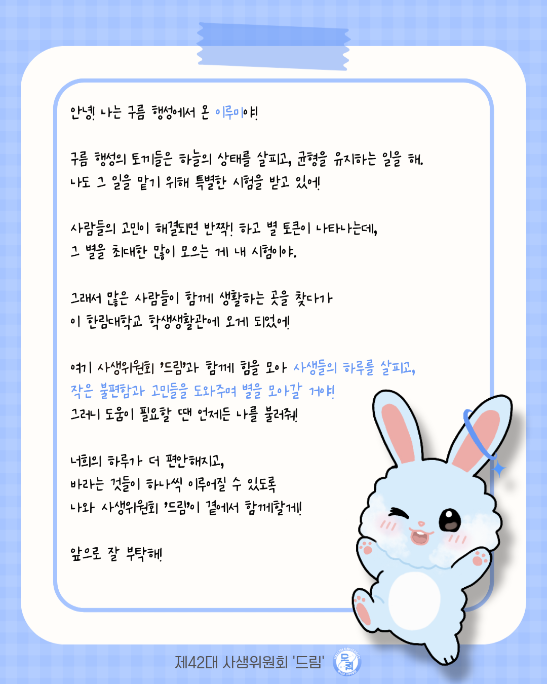 여러분의 하루를 더 밝고 따뜻하게 만들어 줄 귀여운 친구를 소개합니다! 바로 제42대 사생위원회 '드림'의 마스코트, 이루미입니다. ✨