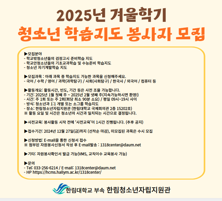 2025년 겨울학기 청소년 학습지도 멘토봉사자 모집