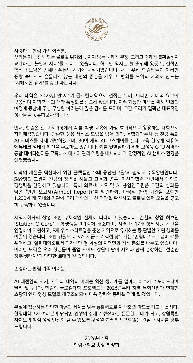 글로컬대학 한림대학교, 대학의 혁신으로 지역의 미래를 설계합니다