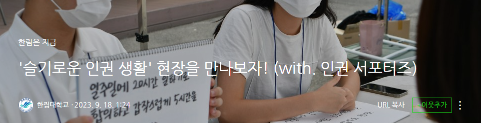 2023년 9월 11일 '슬기로운 인권 생활'이라는 메인 모토 아래 한림대학교 총학생회 인권국과 인권 서포터즈가 함께 인권 캠페인을 진행하였습니다.