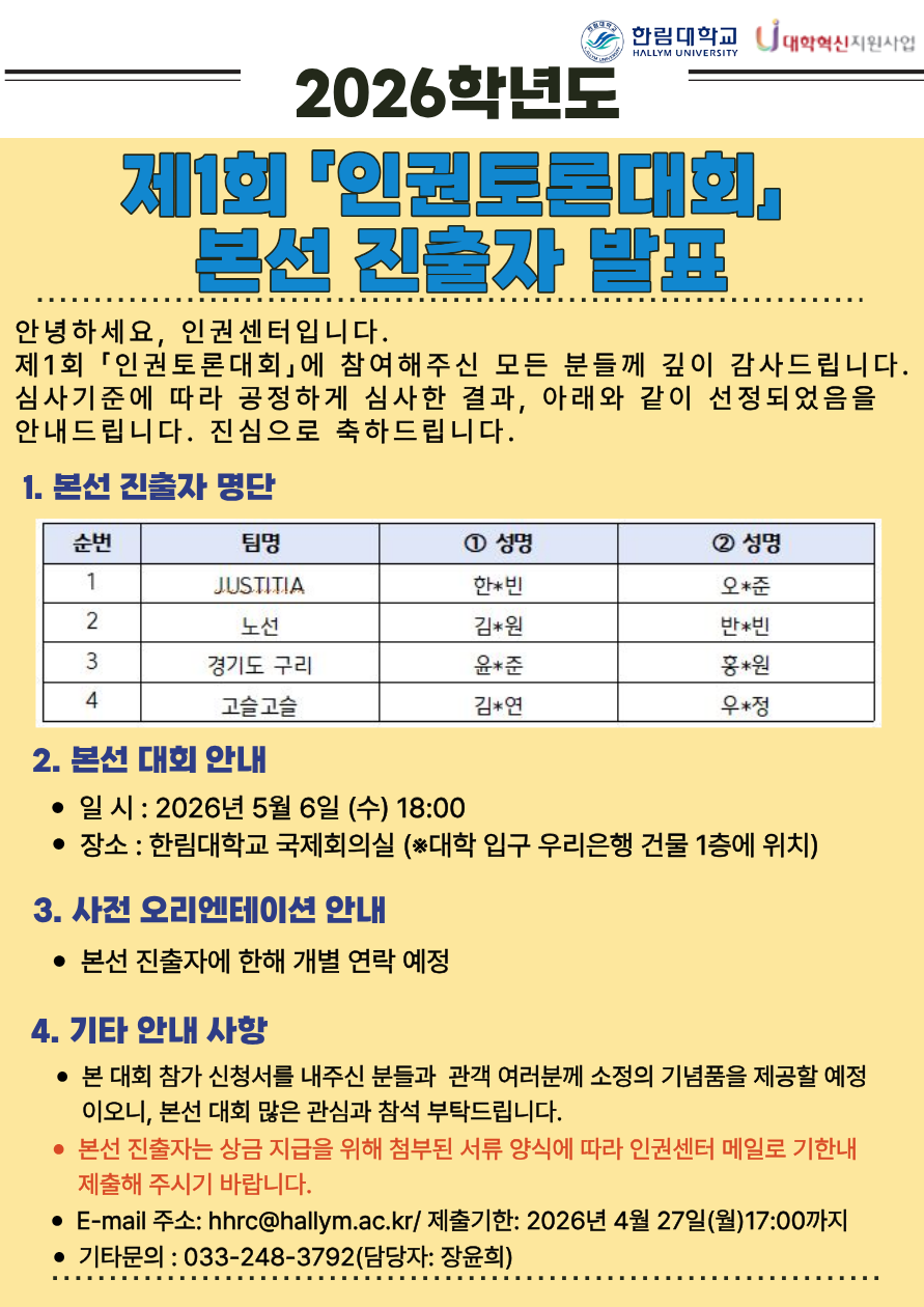 [인권센터] 제1회 인권토론대회 본선 진출자 발표 안내
