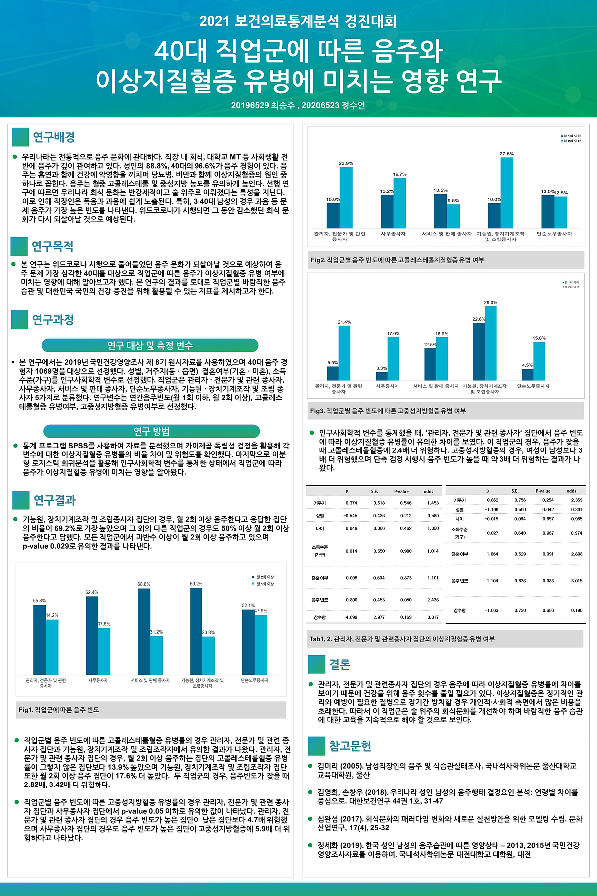 [2021 보건의료통계분석 경진대회] 40대 직업군별 음주가 이상지질혈증 유병에 미치는 영향 연구: 국민건강영양조사 2019를 중심으로