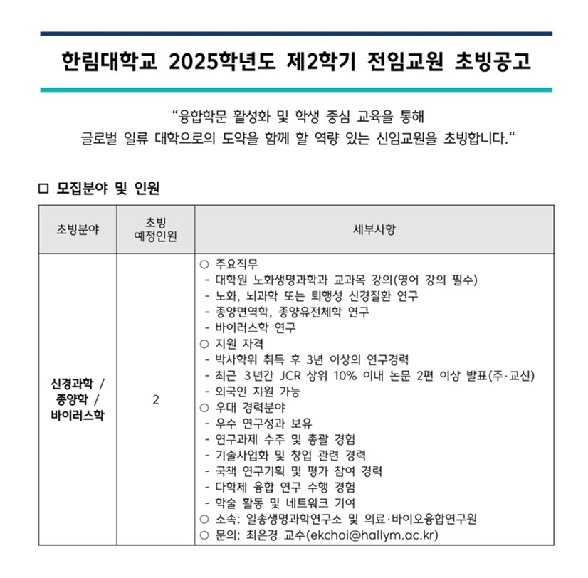 한림대학교 일송생명과학연구소 2025학년도 2학기 전임교원 초빙 공고