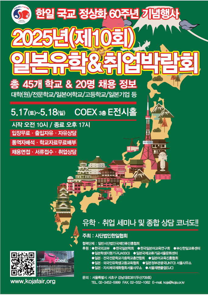 ‘제10회 일본유학&취업 박람회’가 오는 2025년 5월 17일(토)~18일(일), 오전 10시부터 오후 5시까지