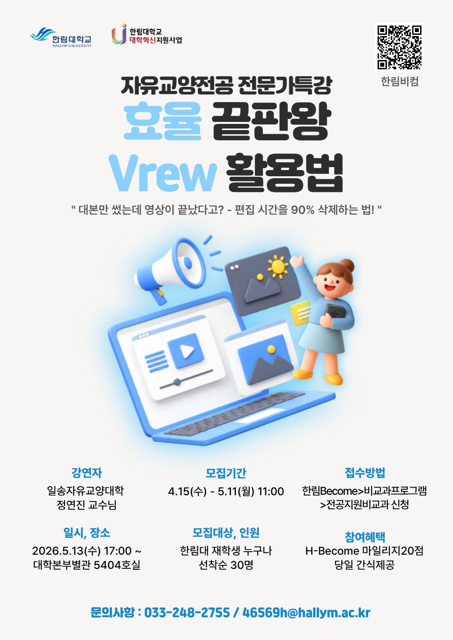 ■ 문의 : 일송자유교양대학 교학팀 자유교양전공 033-248-2755/46569h@hallym.ac.kr