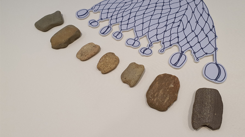 납작한 강돌의 가장자리를 깨뜨려 홈을 만들어 그물 밑 끝에 매달아 사용한 그물추입니다.
