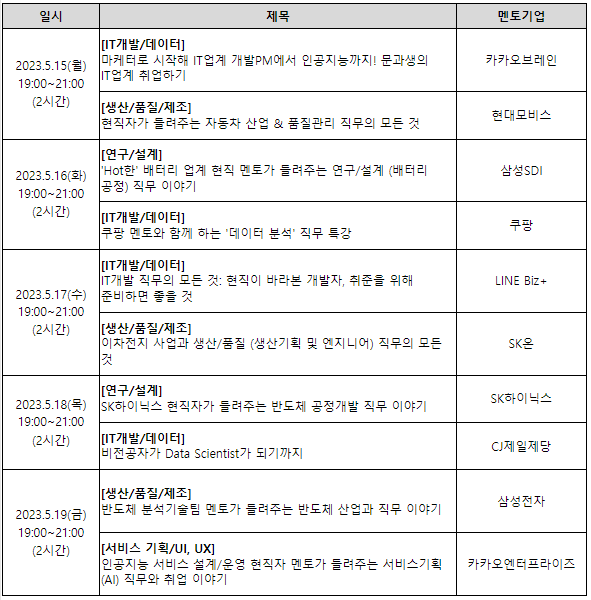 * 기업 현직자 상황에 따라 직무 및 일정이 일부 변경될 수 있습니다.
