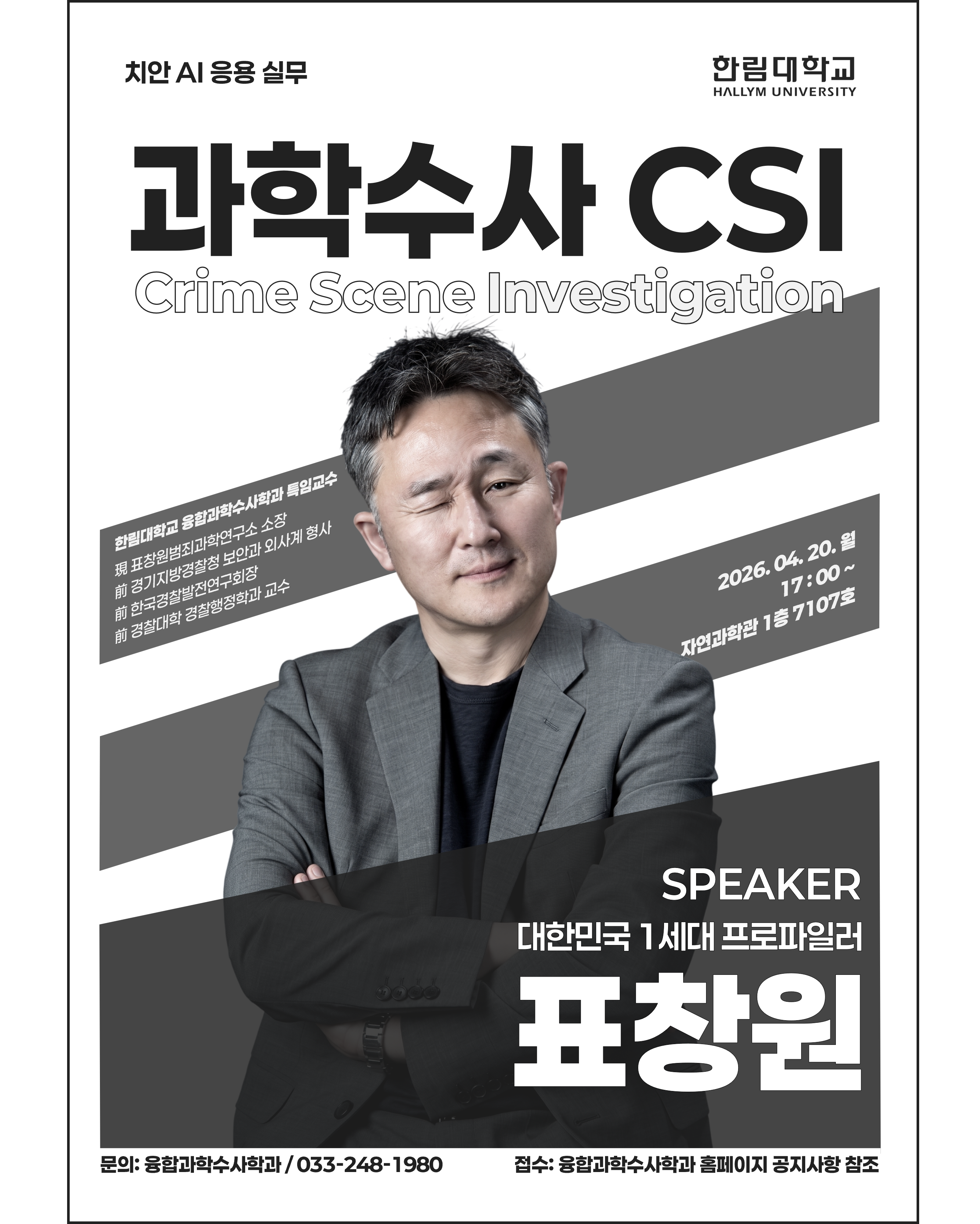 4월 20일 월요일, 본과 특임교수이신 표창원 교수님의 강연이 진행됩니다.