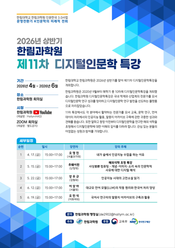 한림대학교(총장 최양희) 한림과학원 HK연구단은 오는 4월 17일(금)부터 ‘2026년 상반기 제11차 디지털인문학 특강’을 개최한다. 이번 특강은 총 5회 강연으로 구성되며, 인공지능을 비롯한 디지털 기술과 인문학 연구·교육의 접점을 다채롭게 조명한다.