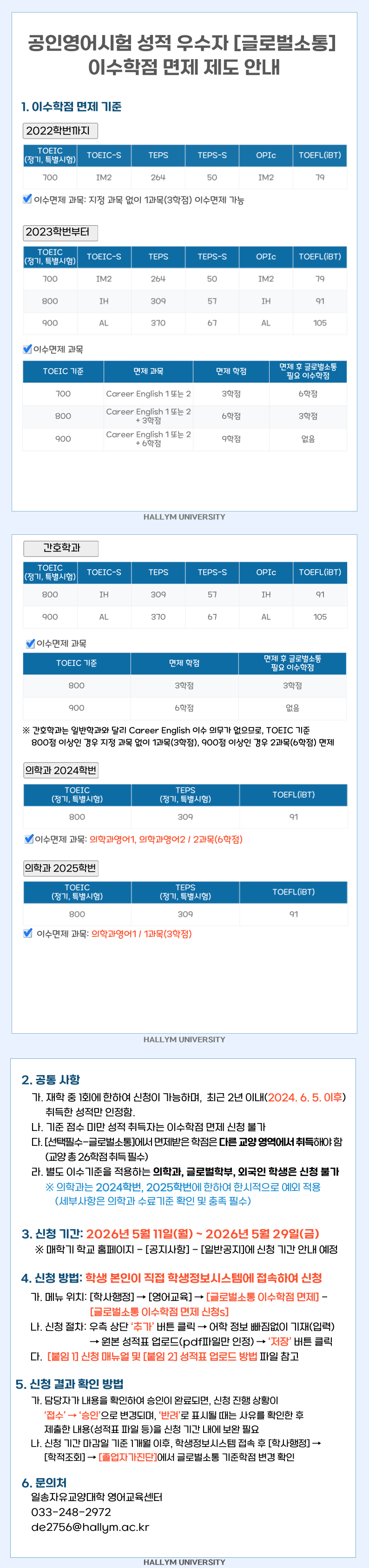 2026-1학기 공인영어시험 성적 우수자 글로벌소통 이수학점 면제 제도