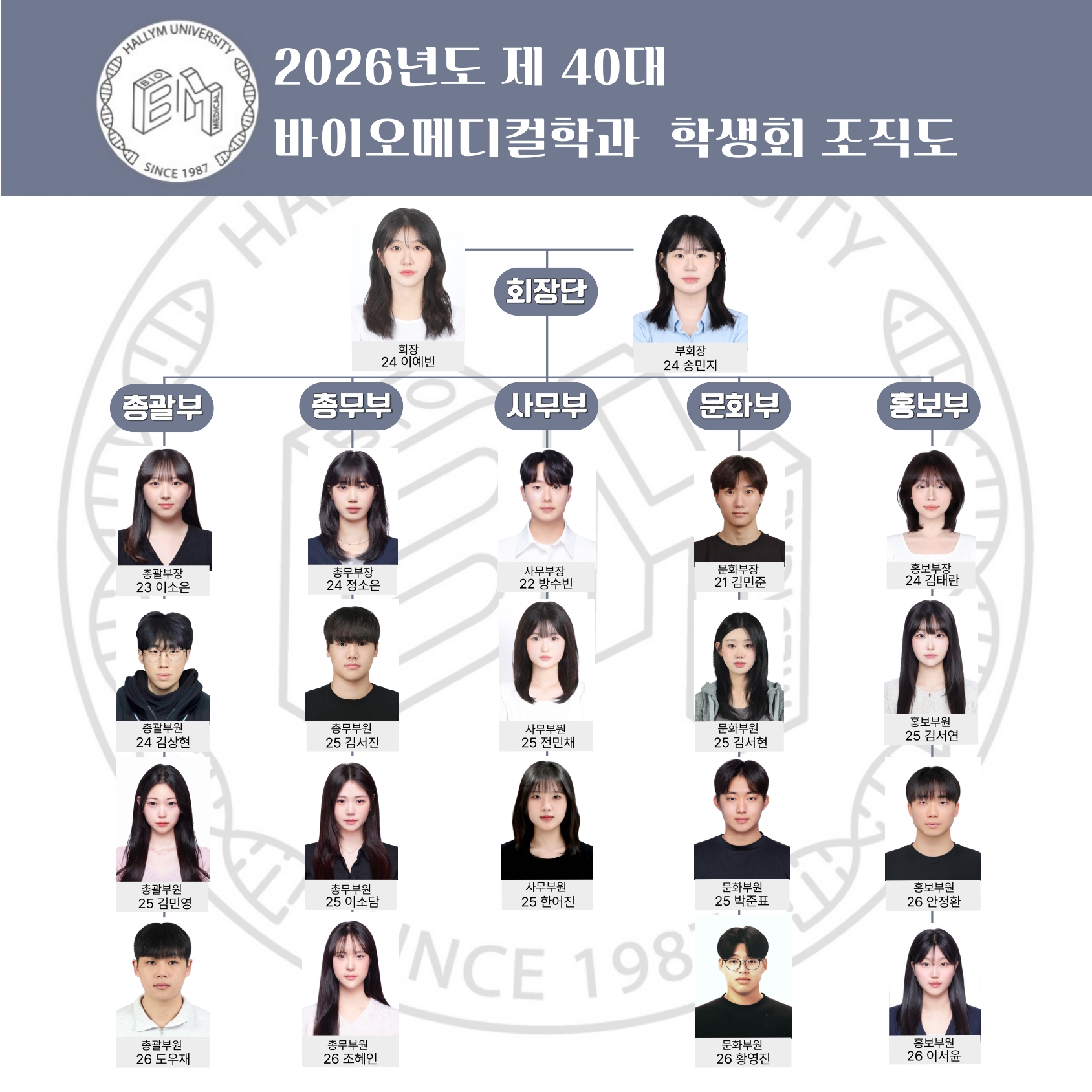 임기 기간 동안 학과 전반적인 계획과 업무를 회장과 함께 관리하며, 회장의 부재 시 학생총회와 대표자회의 소집 및 학과 제반에 권한을 대행합니다.