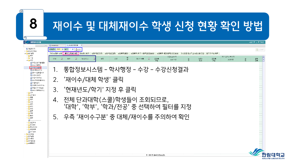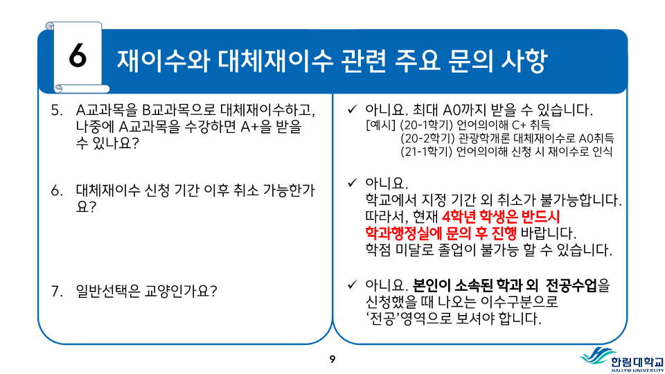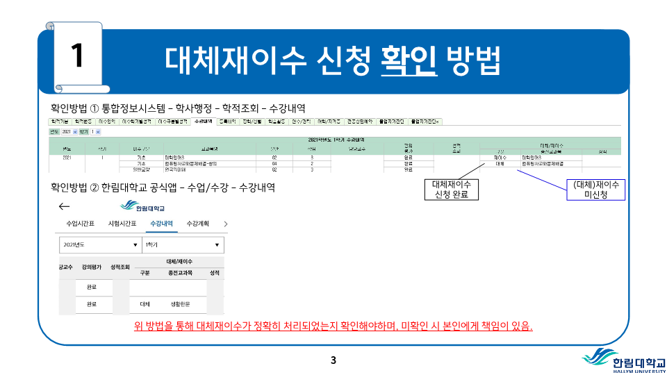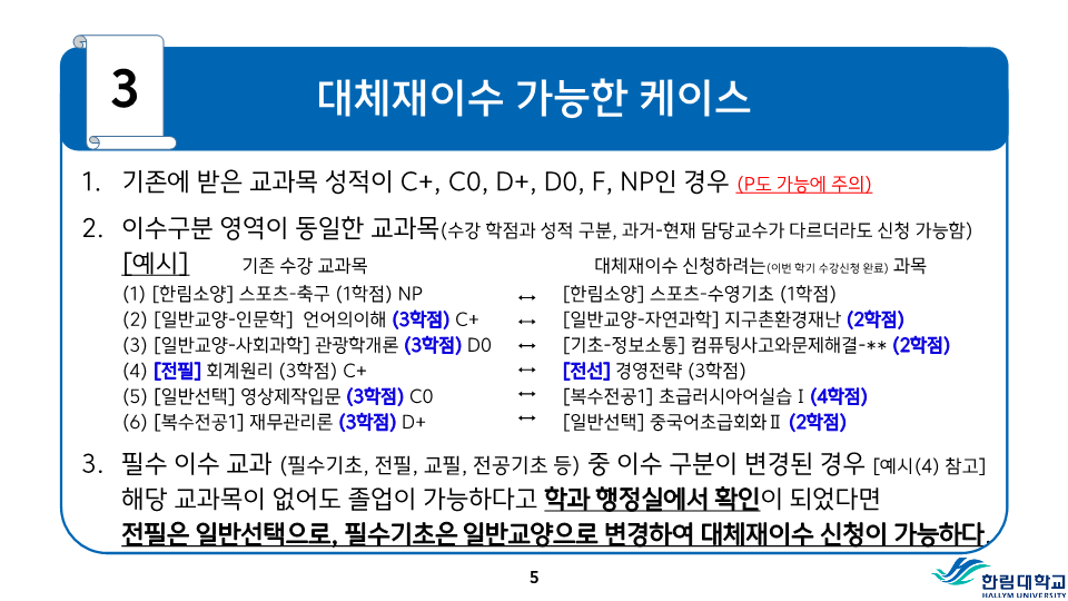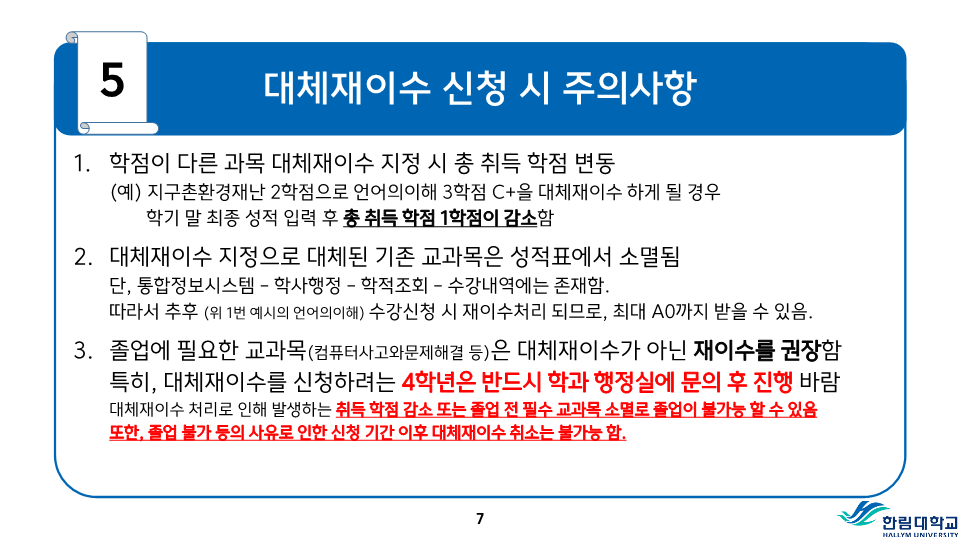 fnctId=bbs,fnctNo=487 RSS 2.0 게시물 검색 제목 작성자 검색어 입력창 게시글 리스트 등급기준 등 성적평가 방식 안내 성적<시험>시험은 정기시험, 비정기시험, 추가시험, 재시험 등으로 구분한다.1) 정기시험 : 중간시험과 학기말시험으로 나누며 중간시험은 학기 당 수업일수 2분의 1이 되는 주에 실시하고, 학기말시험은 학기의 최종 주에 실시한다.2) 비정기시험 : 과제학습, 세미나 등 계속적인 학습활동을 평가하는 시험으로 담당교수의 책임 하에 실시한다.3) 추가시험 : 질병 또는 부득이한 사정으로 정기시험에 응시할 수 없는 학생은 사유와 증빙서류를 첨부하여 추가시험신청서를 제출하여 허가를 받아 정기시험 종료 후 2주일 이내에 추가시험에 응시할 수 있으며 이 경우 성적은 B+를 초과할 수 없다.4) 재시험 : 의과대학, 간호대학에 한하여 실시하며 의예과, 의학과 및 간호학과의 교과목 중 학기말 성적이 40-59점일 때 1회에 한하여 학기말시험 종료 후 2주일 이내에 재시험을 허가할 수 있으며, 성적은 C+를 초과 할 수 없다.시험 부정행위자의 처리1) 시험 중 부정행위가 적발되면 감독교수는 그 행위내용을 시험지 상단에 기록하고 날인한 후 즉시 총장에게 보고한다.2) 시험 부정행위자에 대하여는 다음의 내용에 따라 제적 또는 유기정학 처분한다.가) 제 적- 시험에 대리로 응시하거나 대리응시를 부탁한 경우- 시험지에 다른 사람의 이름을 쓰거나 쓰게 한 경우- 부정행위자로 적발되어 징계처분을 받은 사실이 있는 학생이 거듭 부정행위를 한 경우 나) 유기정학- 시험 중 책, 노트, 메모 등 허락되지 않은 것을 본 경우- 다른 학생의 답안지를 보거나 보여준 경우와 그 밖의 부정행위로 인정되는 행위를 한 경우 <성적>성적평가1) 성적평가는 각 교과목의 시험성적, 과제평가, 출석상황 및 학습태도 등을 종합하여 평가하되 출석 및 학습태도 10-20%, 정기시험 50-70%, 비정기시험 및 과제 20-30%로 함을 원칙으로 한다.2) 성적의 등급은 다음과 같이 분류하여 표기한다. 성적 등급 안내등급평점등급평점A+4.5D+1.5A04.0D01.0B+3.5F0.0B03.0P(Pass)없음C+2.5N(Non Pass)없음C02.0 3) 이수한 교과목의 성적이 D0급 이상 또는 P일 경우는 학점을 취득한 것으로 인정한다.4) 등급에 따른 백분위 기준점수 표 등급에 따른 백분위 기준점수 표 등급평점백분위 기준점수A+4.599A494B+3.589B384C+2.579C274D+1.569D164F0595) 전공과목의 성적평가 등급기준 전공과목의 성적평가 등급기준구분A이상B이상C~F비고이론35% 이하70% 이하잔여비율 3-3-0이론+실습40% 이하잔여비율 실습45% 이하 4-2-2예외과목50% 이하잔여비율 *예외과목: 15명 미만 과목, 영어과목, 교직과목 등*잔여비율: 담당교수 재량6) 기초․교양교과목의 성적평가 등급기준 기초․교양교과목의 성적평가 등급기준구분A이상B이상D~F비고일반과목30%60% 이하20%이하 예외과목절대평가 * 예외과목: 20명 미만 과목, 영어과목, RC과목 등* 출석 미달로 인해 F등급을 부여한 학생 및 교환학생은 등급 비율대상에서 제외7) 교과목 주당 수업시간의 3배를 초과하여 결석하였을 때 출석 미달로 F등급을 부여한다. 다만 담당 교수가 3배를 초과하지 않는 범위에서 자율적으로 정할 수 있으며, 수업계획서에 표시해야 한다. 또한, 3회의 지각은 한 번의 결석으로 본다.8) 학기 중 휴학한 학생의 휴학학기 성적은 인정하지 아니하며 그 학기의 수강신청은 취소된다.9) 각 교과목의 담당교수 및 강사는 학기말시험 종료 후 10일 이내에 담당교과목의 성적을 게시하고 통합정보시스템에 접속하여 웹으로 성적입력을 완료하여야 한다. <성적의 정정>1) 제출된 성적은 기재착오(성적의 오기 또는 누락) 등 부득이한 사유가 있는 경우에 한하여 총장의 허가를 받아 정정할 수 있다.2) 성적정정 절차가) 학생은 성적을 조회 확인하여야 하며, 성적에 이의가 있을 경우 담당교수에게 성적이의신청을 하여야 한다.나) 담당교수는 학생으로부터 이의신청을 받은 후 이를 검토하여 사유가 인정될 경우 학기말시험 종료 후 2주 이내에 사유서 및 증빙자료를 첨부한 성적정정원을 교무팀에 제출한다.다) 학생이 성적확인/정정기간에 정정신청을 하지 않은 경우에는 추후 성적에 대한 이의를 제기할 수 없다.3) 방학기간 중 수업, 해외현지수업 등 학기말시험 종료 후 10일 이내에 성적제출이 곤란한 교과목의 경우에는 성적제출 및 정정기간을 따로 정하여 시행할 수 있다. 성적평점평균의 계산1) 과목별 성적평점의 계산은 그 과목의 학점수와 성적등급의 평점을 곱하여 산출한다. 2) 성적평점평균의 계산은 학점을 사용한 가중평균법에 의하며, 소수 세째자리에서 반올림한다.3) 총 성적평점평균의 계산에는 재이수 교과목의 이전 성적은 산입하지 아니한다.4) 취득학점수가 다르고 성적평점평균이 동일한 경우에는 학점계가 많은 학생을 우선한다. 5) 성적등급이 P와 N으로 표시되는 교과목의 학점 및 성적은 성적평점평균 및 순위계산에서 제외한다.<성적경고와 유급, 우등생>1) 성적경고 가) 학기말 성적평점평균이 2.00 미만(의예과 2.20 미만)인 경우에는 예비성적경고를 한다.나) 신입생의 1학년 1학기 성적경고는 적용하지 아니한다. 다만, 의예과 학생은 